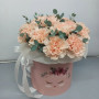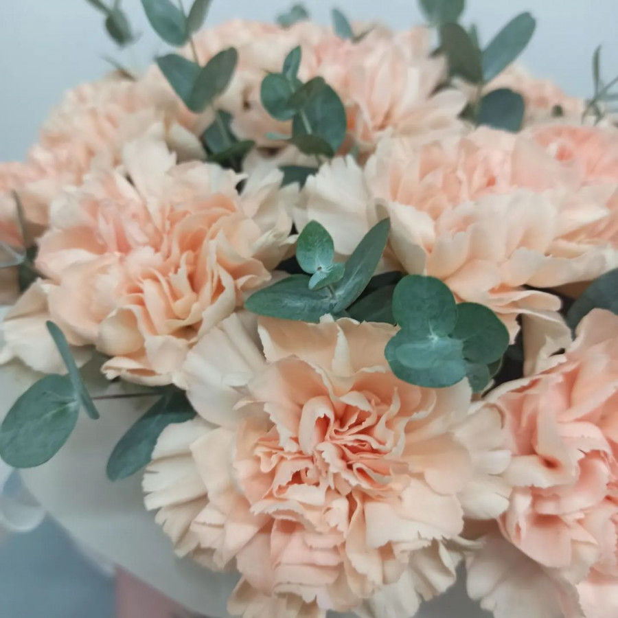 21 красивая кремовая гвоздика, оформленная в шляпную коробку, станет прекрасным подарком ко дню рождения или любому другому празднику. Гвоздики - символ элегантности, изысканности и роскоши, а кремовый цвет придает букету легкость и воздушность, создавая атмосферу нежности и уюта. Шляпная коробка подчеркивает красоту и оригинальность букета, а атласные ленты с бантами добавляют ему еще больше шарма и роскоши. Такой букет будет радовать получателя своим изысканным видом и приятным ароматом, напоминая ему о вашей любви и заботе.