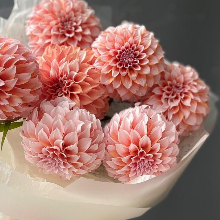 На фото букет из 7 персиковых георгин. В составе: георгина 7 шт, зелень 3 шт, дизайнерская упаковка 1 шт, атласная лента 1 шт, . Все цветы свежие и ароматные, букет красиво оформлен и отлично подходит для подарка. Доступна доставка цветов или самовывоз.