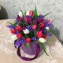 27 тюльпанов в шляпной коробке ярких малиновых и сиреневых оттенков и веточками статицы. Такой чудесный подарок удивит получательницу и сделает ее день ярче, украсив весенними апрельскими тюльпанами, подарив сладкие ароматы весны.