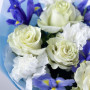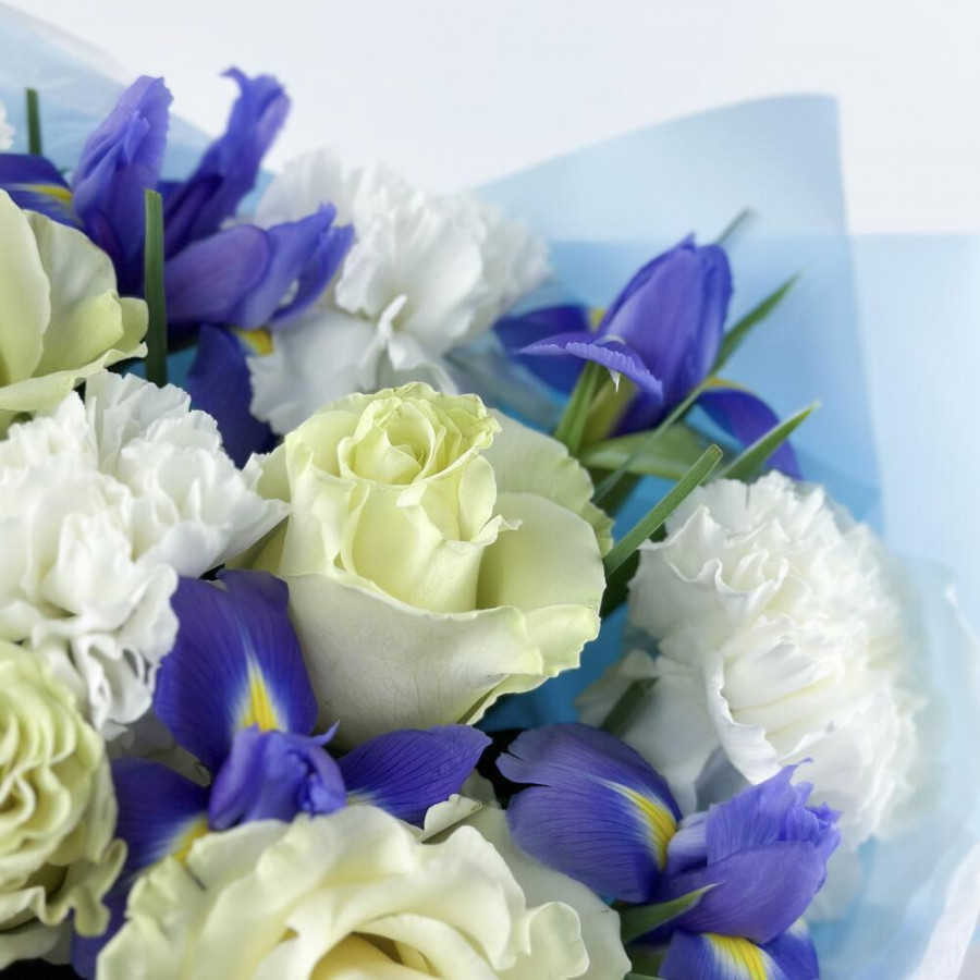 Букет из белых гвоздик, синих ирисов и белых роз в Буе
