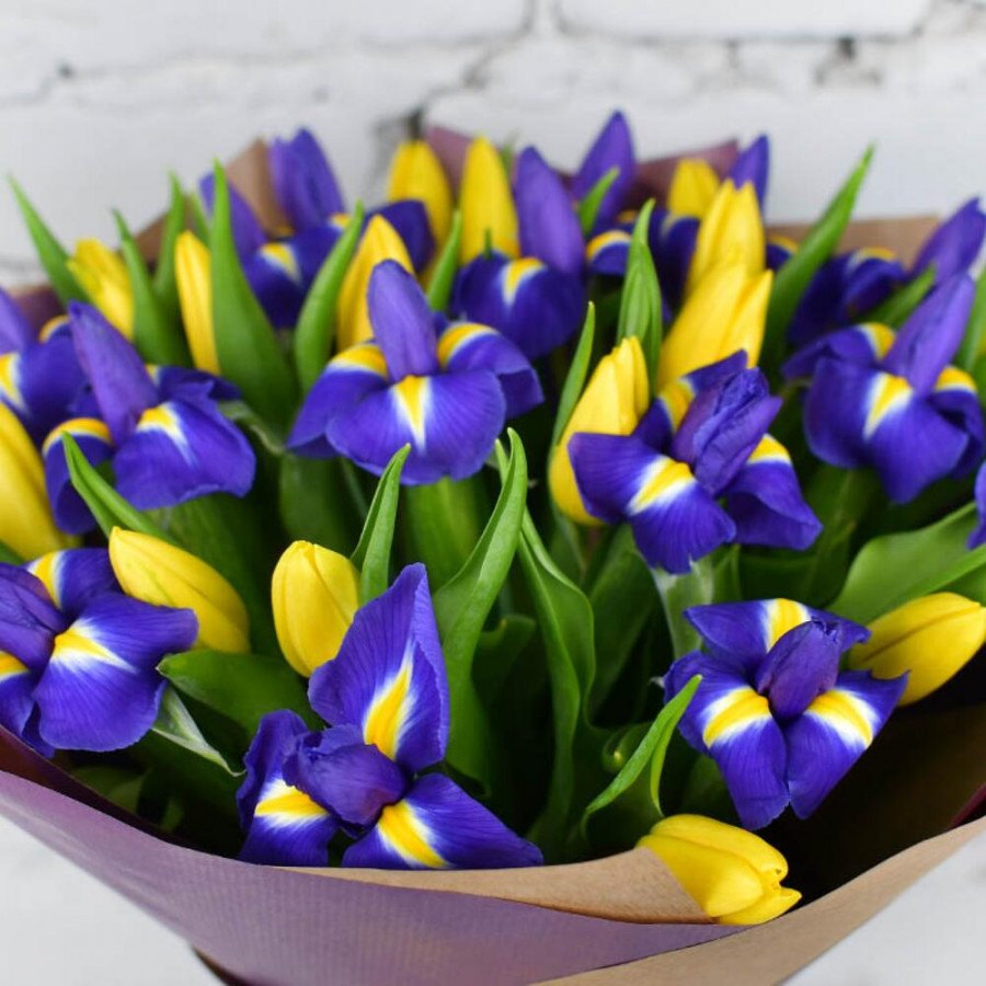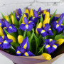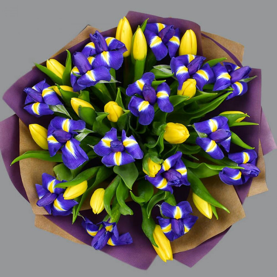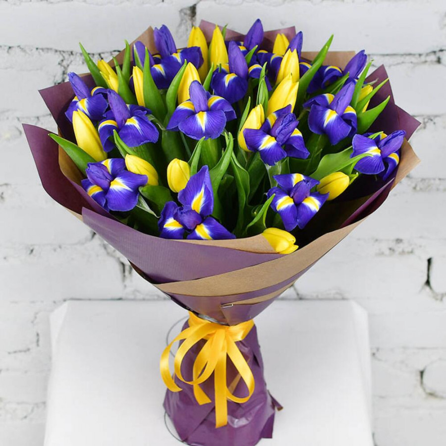 Букет из синих ирисов и желтых тюльпанов в Буе