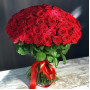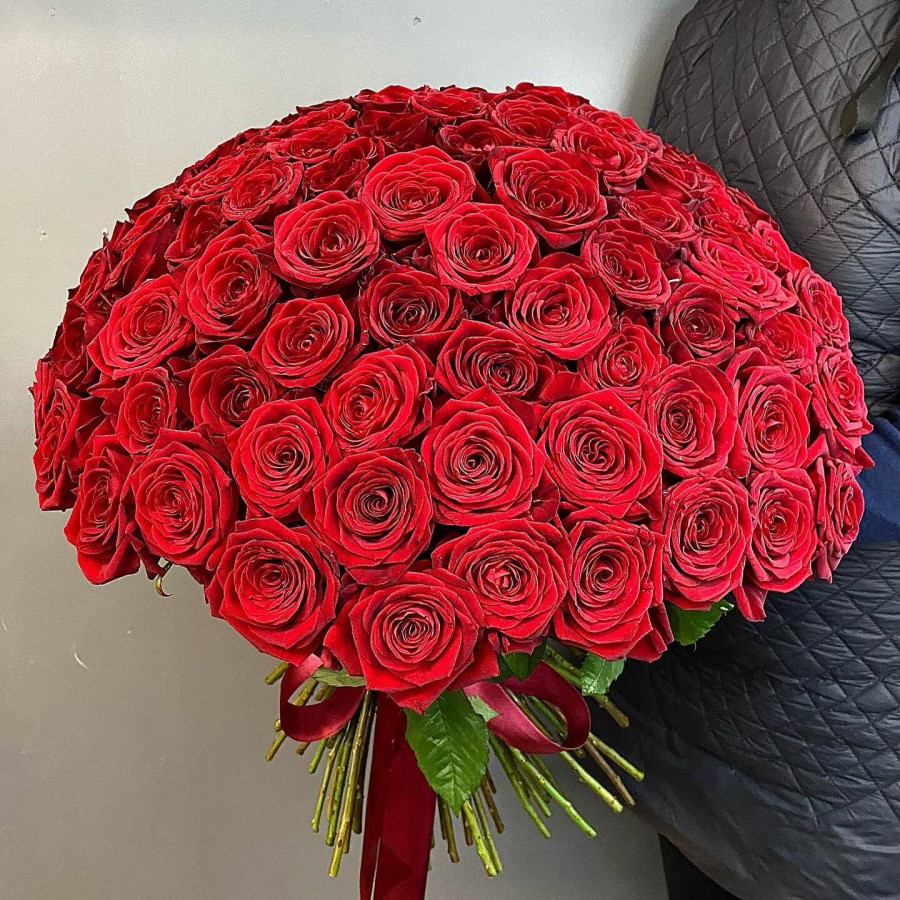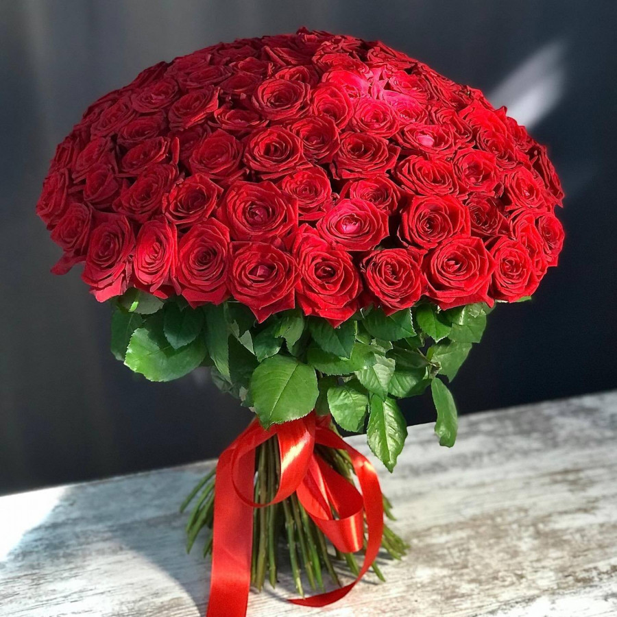 Букет из 101 красной розы, перевязанный лентой, - это прекрасный подарок для особого случая. Красные розы означают страсть, любовь, восхищение, а лента добавляет букету элегантности. Этот букет будет долго храниться и напоминать о ваших чувствах.