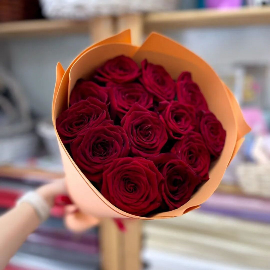 На фото букет из 13 красных роз. В составе: роза 13 шт, крафт-бумага 1 шт, атласная лента 1 шт, . Все цветы свежие и ароматные, букет красиво оформлен и отлично подходит для подарка. Доступна доставка цветов или самовывоз.