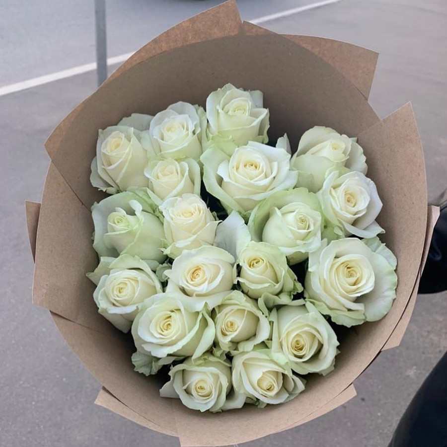 На фото букет из 19 белых роз. В составе: роза 19 шт, крафт-бумага 1 шт, атласная лента 1 шт, . Все цветы свежие и ароматные, букет красиво оформлен и отлично подходит для подарка. Доступна доставка цветов или самовывоз.