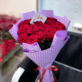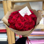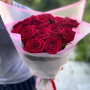 На фото букет из 21 красной розы. В составе: роза 21 шт, крафт-бумага 1 шт, атласная лента 1 шт, . Все цветы свежие и ароматные, букет красиво оформлен и отлично подходит для подарка. Доступна доставка цветов или самовывоз.