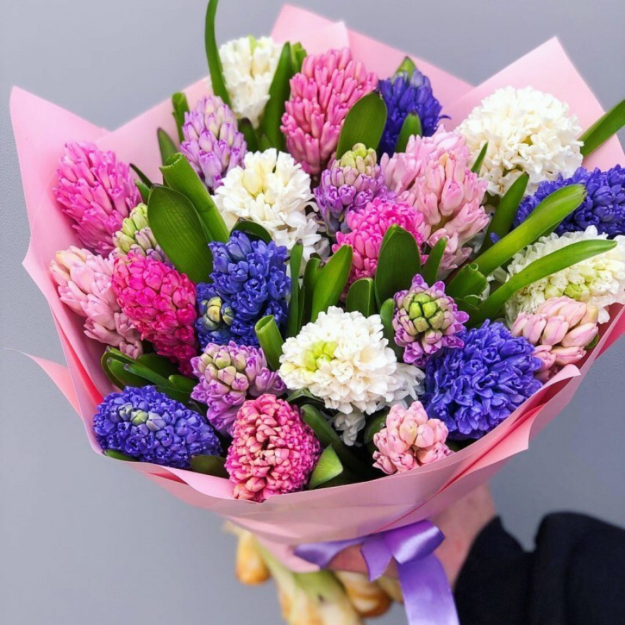 На фото букет из 25 разноцветных гиацинтов. В составе: гиацинт 25 шт, крафт-бумага 1 шт, атласная лента 1 шт, . Все цветы свежие и ароматные, букет красиво оформлен и отлично подходит для подарка. Доступна доставка цветов или самовывоз.