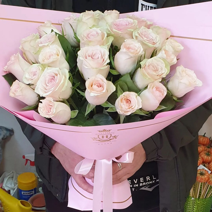 На фото букет из 27 розовых роз. В составе: роза 27 шт, крафт-бумага 1 шт, атласная лента 1 шт, . Все цветы свежие и ароматные, букет красиво оформлен и отлично подходит для подарка. Доступна доставка цветов или самовывоз.