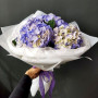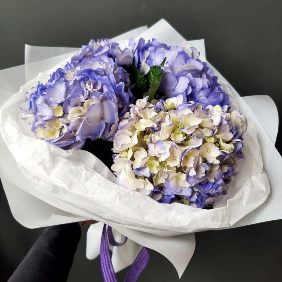 На фото букет из 3 голубых гортензий. В составе: гортензия 3 шт, крафт-бумага 1 шт, атласная лента 1 шт, . Все цветы свежие и ароматные, букет красиво оформлен и отлично подходит для подарка. Доступна доставка цветов или самовывоз.