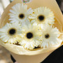 На фото букет из 5 белых гербер. В составе: гербера 5 шт, крафт-бумага 1 шт, атласная лента 1 шт, . Все цветы свежие и ароматные, букет красиво оформлен и отлично подходит для подарка. Доступна доставка цветов или самовывоз.