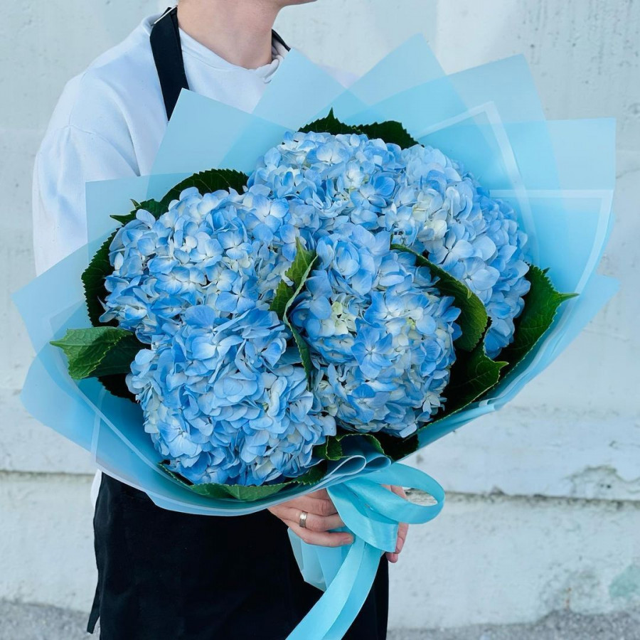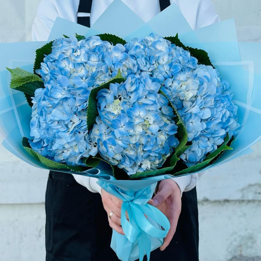 На фото букет из 5 голубых гортензий. В составе: гортензия 5 шт, крафт-бумага 1 шт, атласная лента 1 шт, . Все цветы свежие и ароматные, букет красиво оформлен и отлично подходит для подарка. Доступна доставка цветов или самовывоз.