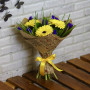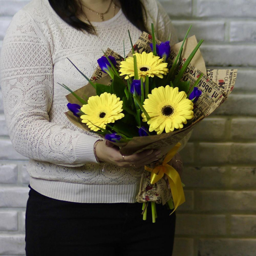 Букет из желтых гербер с синими ирисами в Буе
