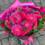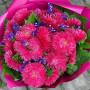 На фото букет из красных астр и статицы. В составе: астра 19 шт, статица 4 шт, крафт-бумага 1 шт, атласная лента 1 шт, . Все цветы свежие и ароматные, букет красиво оформлен и отлично подходит для подарка. Доступна доставка цветов или самовывоз.