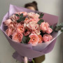 На фото букет из пионовидные роз с эвкалиптом. В составе: кустовая пионовидная роза 11 шт, эвкалипт 2 шт, крафт-бумага 1 шт, . Все цветы свежие и ароматные, букет красиво оформлен и отлично подходит для подарка. Доступна доставка цветов или самовывоз.