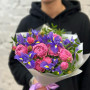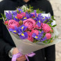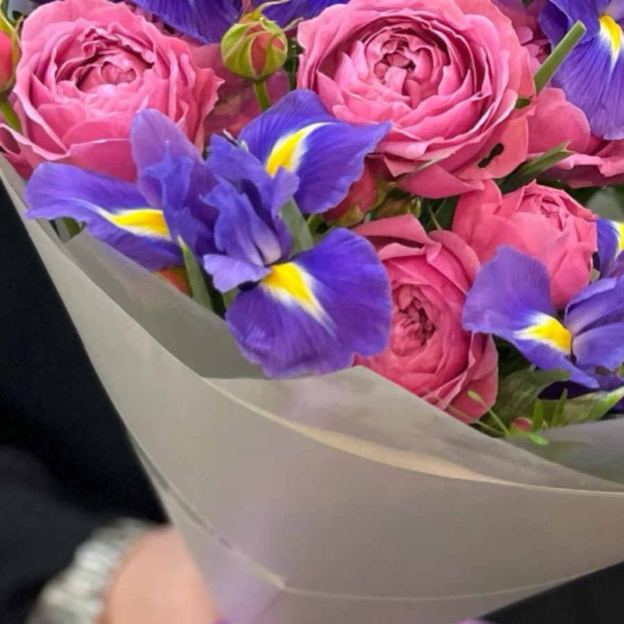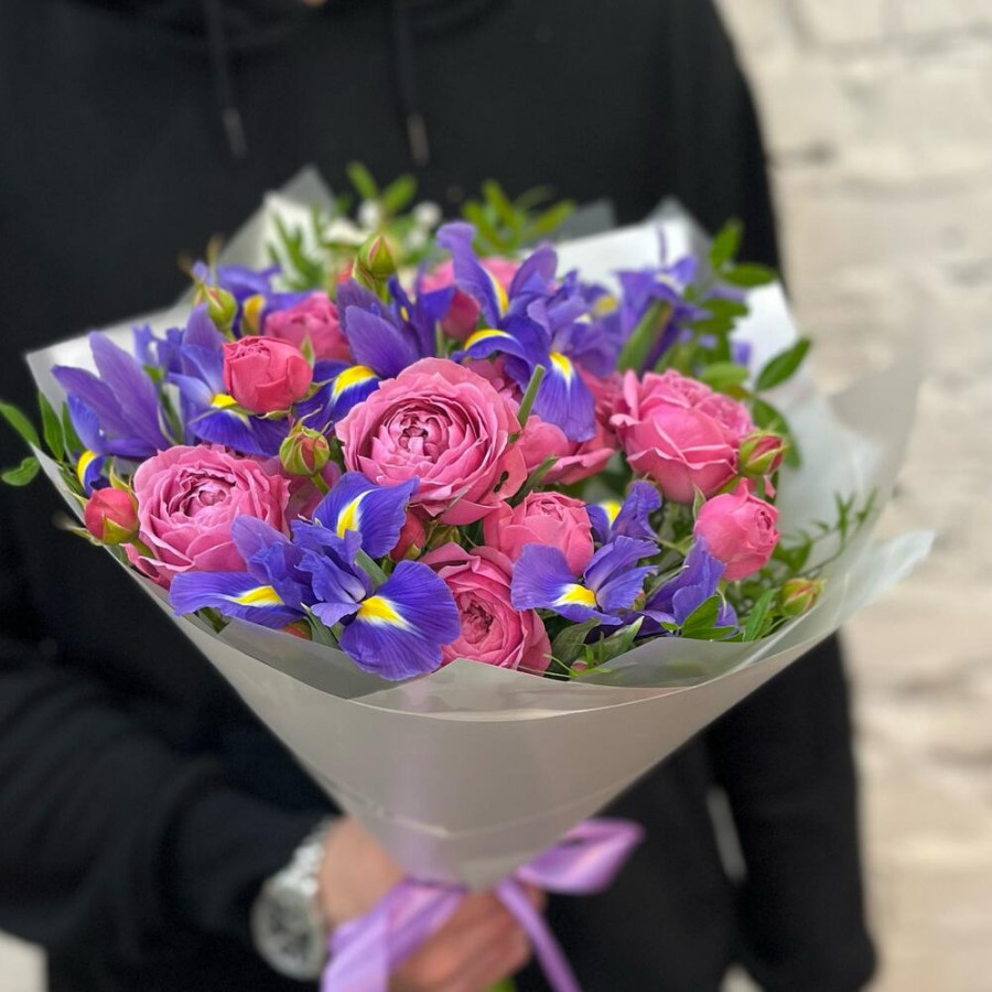 Букет из розовых пионовидных роз и синих ирисов в Буе