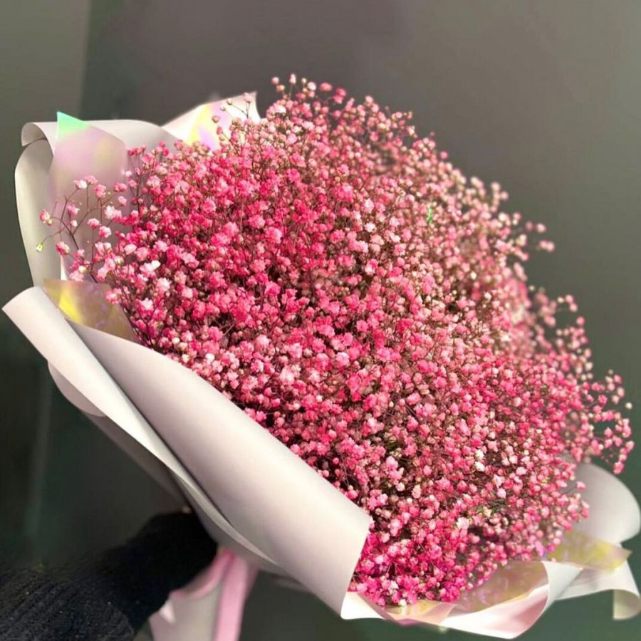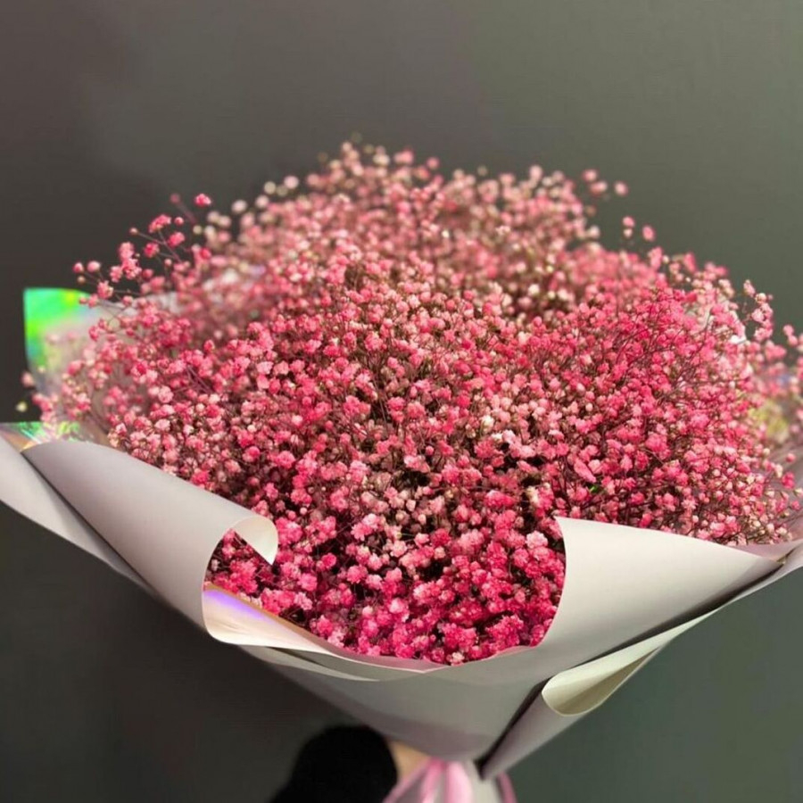 На фото букет из розовой гипсофилы. В составе: гипсофила 11 шт, крафт-бумага 1 шт, атласная лента 1 шт, . Все цветы свежие и ароматные, букет красиво оформлен и отлично подходит для подарка. Доступна доставка цветов или самовывоз.