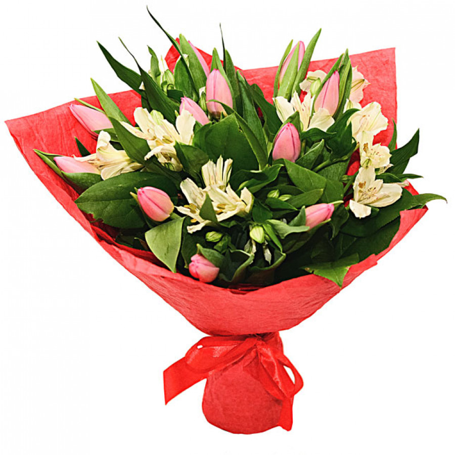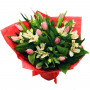 11 тюльпанов и четыре альстромерии в яркой фетровой упаковке - это чудесный букет-комплимент, который несомненно станет для получательницы причиной улыбаться, а ее мысли на весь день будут заняты Вами. Пестрые тюльпаны и искрящиеся веточки альстромерий - это радостный светлый день и счестливый блеск в глазах получательницы.