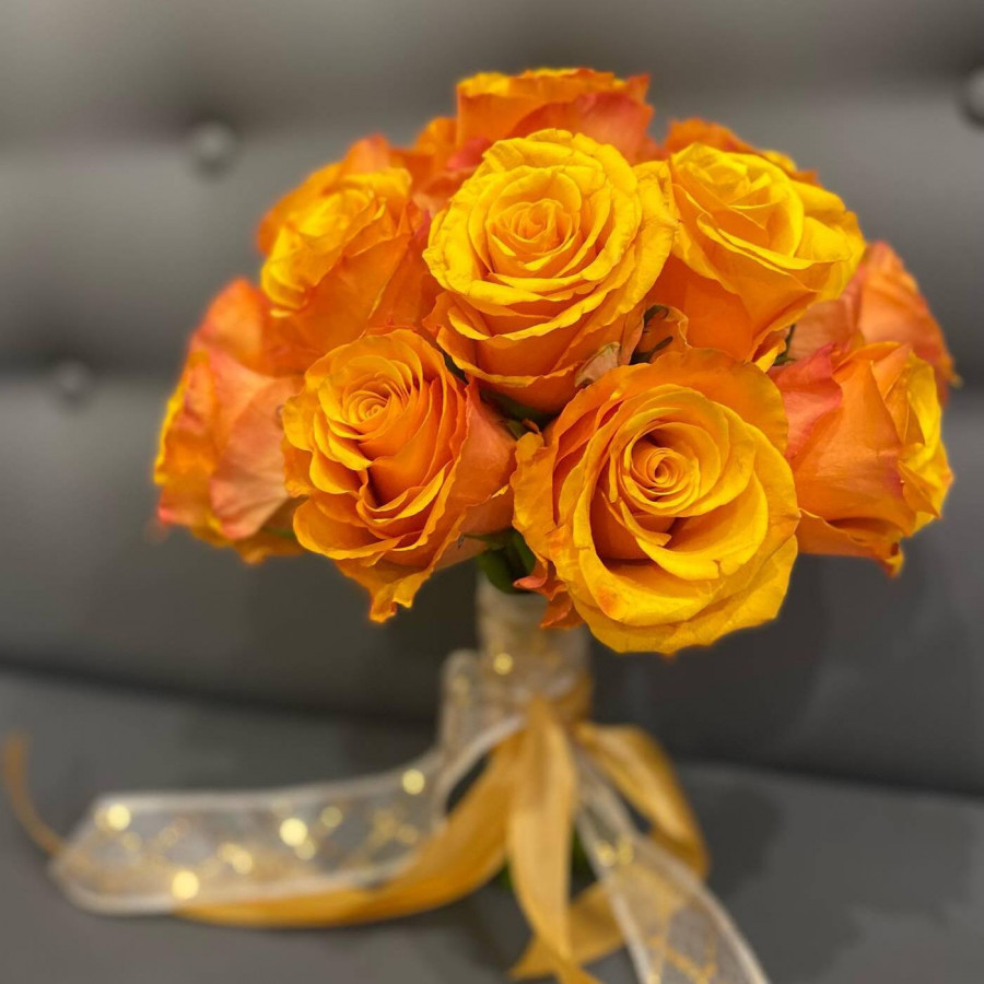 На фото букет невесты из желтых роз. В составе: роза 11 шт, атласная лента 1 шт, . Все цветы свежие и ароматные, букет красиво оформлен и отлично подходит для подарка. Доступна доставка цветов или самовывоз.