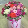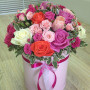 Яркое переплетение ярких роз из Эквадора и Кении, кустовых розочек и нежной свежей зелени с крапинами ягодок гиперикума в розовой шляпной коробке с бантом станет идеальным подарком для торжества, который заставит получательницу восхититься Вашим вкусом и еще долго думать о Вас.
