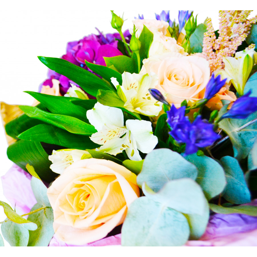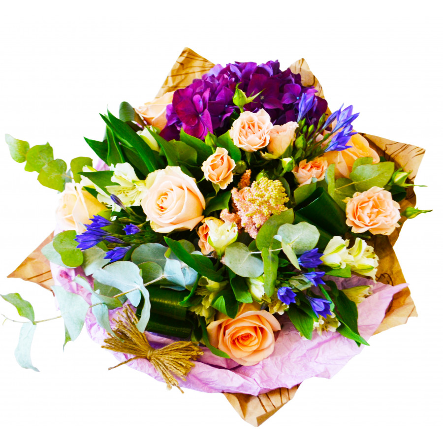 Нежное сочетание персиковых роз,эустомы и альстромерии, а также яркой, глубокого амарантового цвета гортензией станет изысканным подарком на праздник, подчеркнув Ваш вкус и чувства к получательнице. Его неповторимые цвета и яркий сладковатый аромат наполнят комнату восточными мотивами, превратив ее в богатый замок султана.