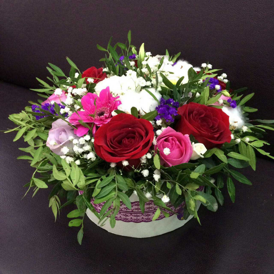 Нежный пушистый хлопок в окружении ярких алых и розовых роз и гермини с вкрапиными лимониума и пушистой, как первый снег, гипсофилой - это изящный подарок, который можно дарить абсолютно без повода, только лишь для того, чтобы увидеть чудесную улыбку любимой и благодарность в глазах. Ведь для Вас это уже повод.