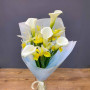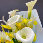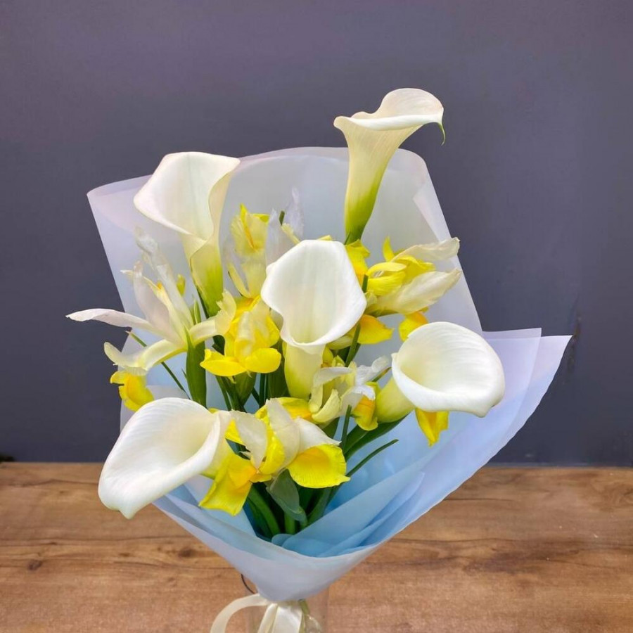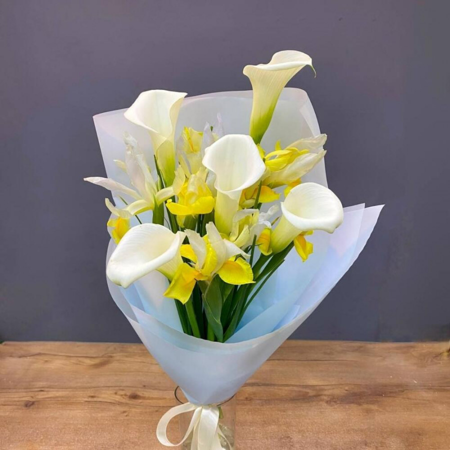 Букет из желтых ирисов и беллых калл в Буе