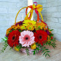 На фото корзина с герберами и хризантемами. В составе: гербера 7 шт, хризантема кустовая 5 шт, писташ 3 шт, корзина (s) 1 шт, . Все цветы свежие и ароматные, букет красиво оформлен и отлично подходит для подарка. Доступна доставка цветов или самовывоз.