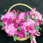 На фото корзина с пионовидными розами и гортензией. В составе: гортензия 7 шт, кустовая пионовидная роза 7 шт, эвкалипт 3 шт, корзина (l) 1 шт, . Все цветы свежие и ароматные, букет красиво оформлен и отлично подходит для подарка. Доступна доставка цветов или самовывоз.