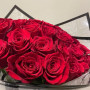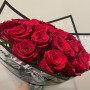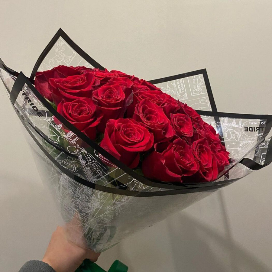 На фото красные розы в черной упаковке. В составе: роза 19 шт, крафт-бумага 1 шт, атласная лента 1 шт, . Все цветы свежие и ароматные, букет красиво оформлен и отлично подходит для подарка. Доступна доставка цветов или самовывоз.