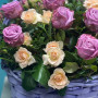 На фото кустовые розы в корзине. В составе: роза 25 шт, кустовая роза 11 шт, писташ 2 шт, туя 2 шт, . Все цветы свежие и ароматные, букет красиво оформлен и отлично подходит для подарка. Доступна доставка цветов или самовывоз.