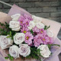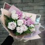На фото сборный букет с сиреневыми розами. В составе: роза 11 шт, хризантема кустовая 2 шт, крафт-бумага 1 шт, атласная лента 1 шт, . Все цветы свежие и ароматные, букет красиво оформлен и отлично подходит для подарка. Доступна доставка цветов или самовывоз.